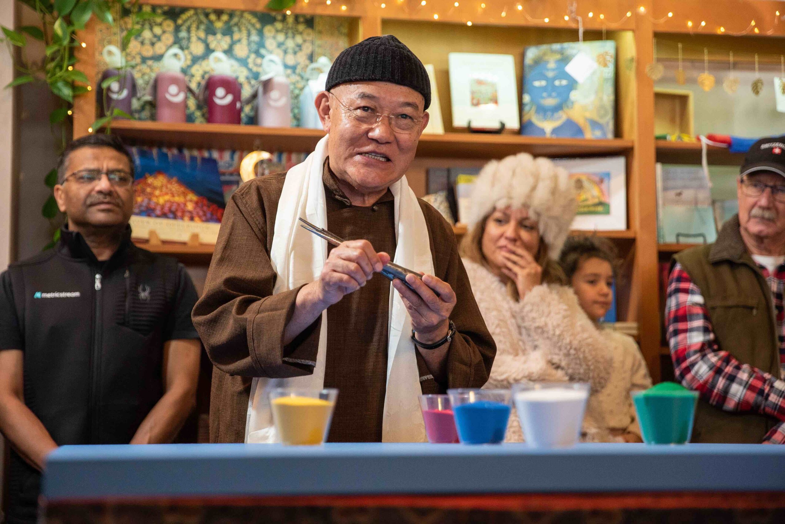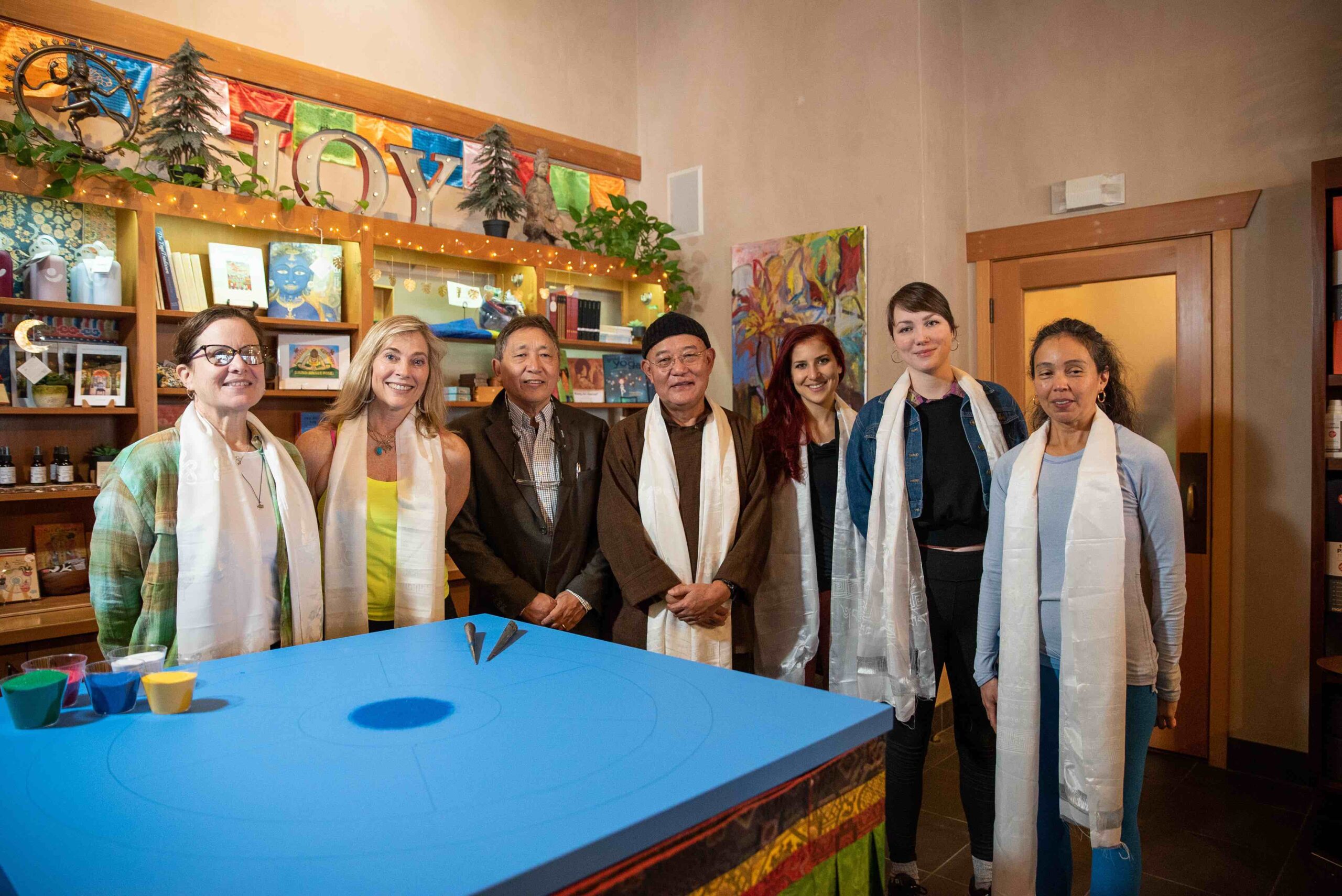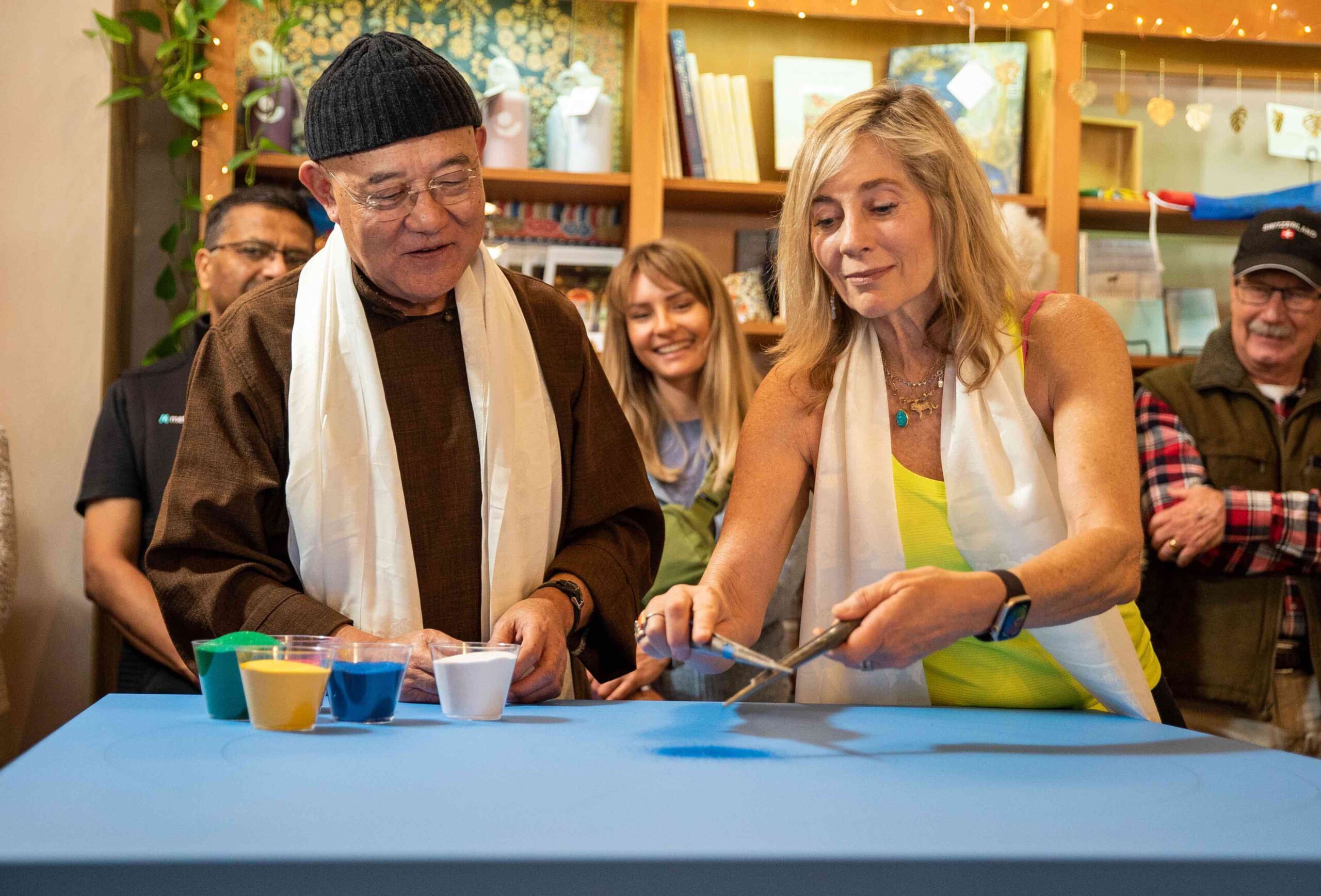 | I feel privileged for another opportunity to share Tibetan culture. This January, we did another Tibetan sand mandala at Breathe Together Yoga, Los Gatos. We had the pleasure of having Losang Samten la create a Tibetan Wheel of Life mandala.Every master is different – they bring their learning, experiences, and personality to an event. I loved that Losang Samten la was so open and accessible. It is clear that he enjoys what he does – creating mandalas and then sharing/interacting with the folks who come to the event. In all my years of travel with Tibetan cultural ambassadors, I’ve not met someone who is so palpably happy to meet people and share our culture. He is truly a great ambassador of our culture – and it’s been a privilege to facilitate this event. |